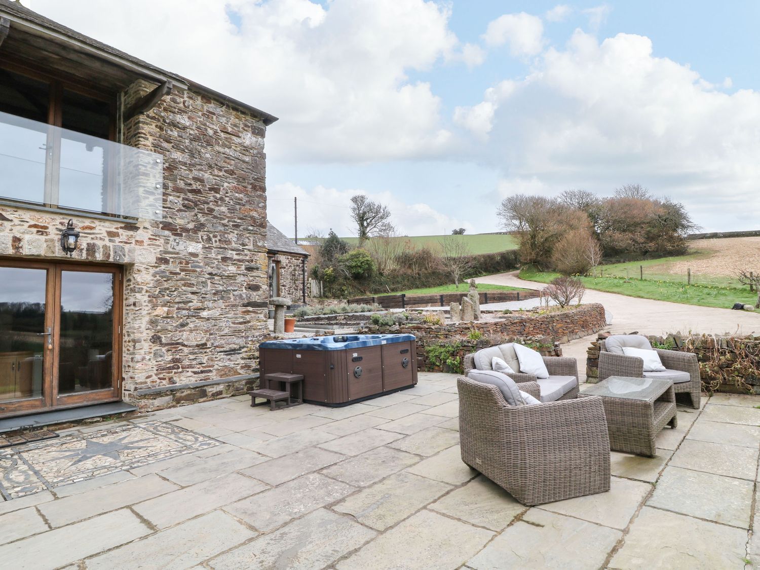 Four bedrooms: 1 x super king with en-suite roll-top, freestanding bath, walk-in shower, basin and WC, 1 x ground-floor king-size, 1 x double, 1 x ground-floor twin. Ground-floor shower room with walk-in shower, basin, and WC. Open-plan living space with kitchen, dining area and sitting area with vaulted ceiling and woodburning stove