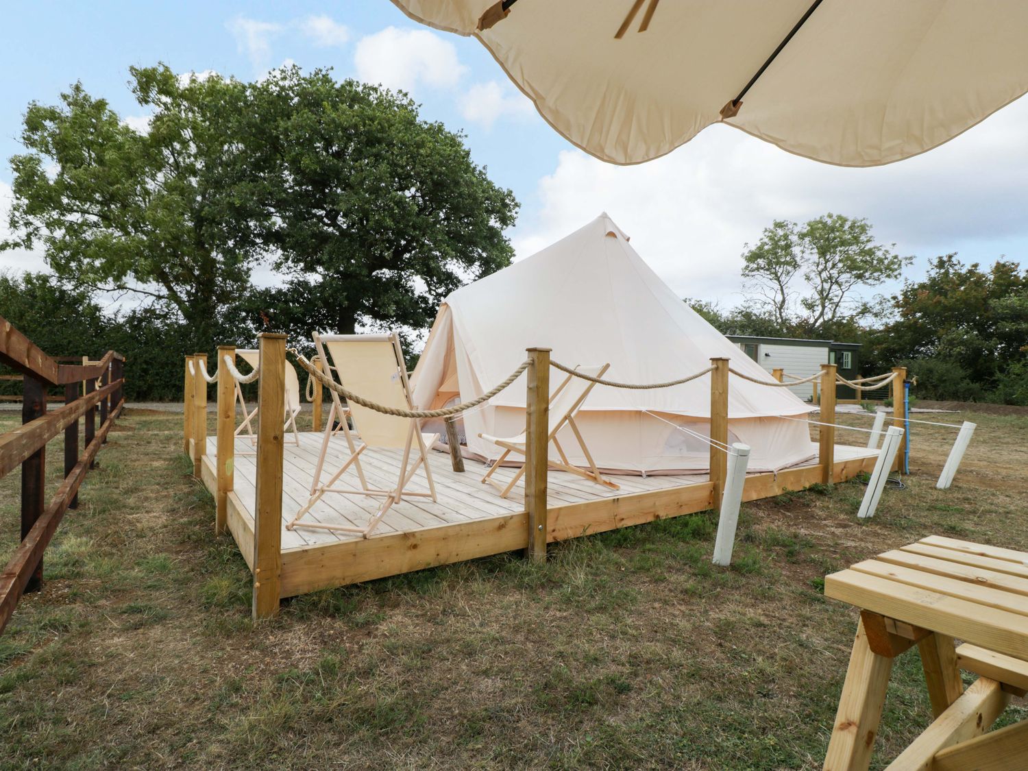 Single-storey Bell Tent. Studio-style living space with two double beds, and living area. Communal kitchen with microwave. Communal shower/toilet block