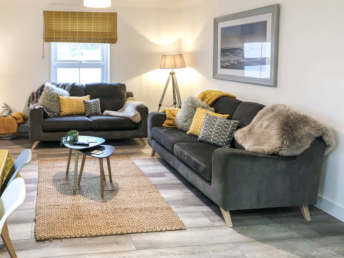 Single-storey. Two bedrooms: 1 x double with en-suite walk-in shower, basin and WC, 1 x twin. Bathroom with bath, shower over, basin and WC. Open-plan living space with kitchen, dining area and sitting area with electric fire