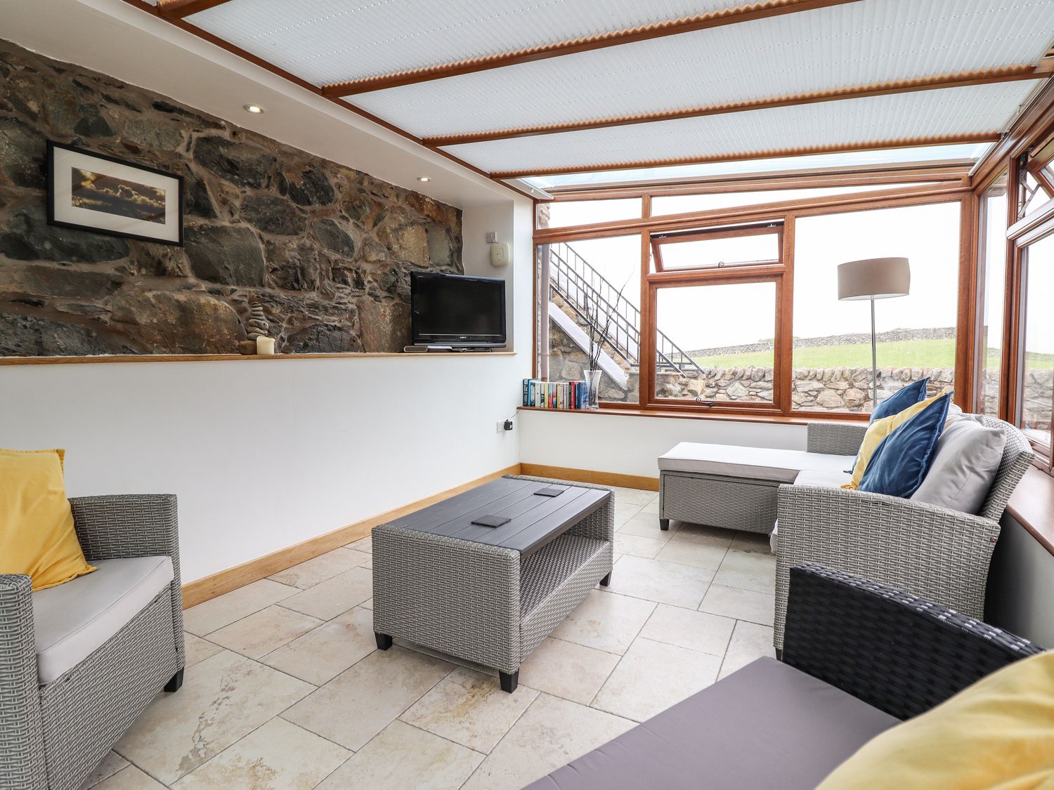 Two bedrooms: 1 x double and 1 x twin. Bathroom with bath, shower over, basin and WC. Kitchen. Dining room. Sitting Room. Outside WC. Garden with patio furniture and summer house.