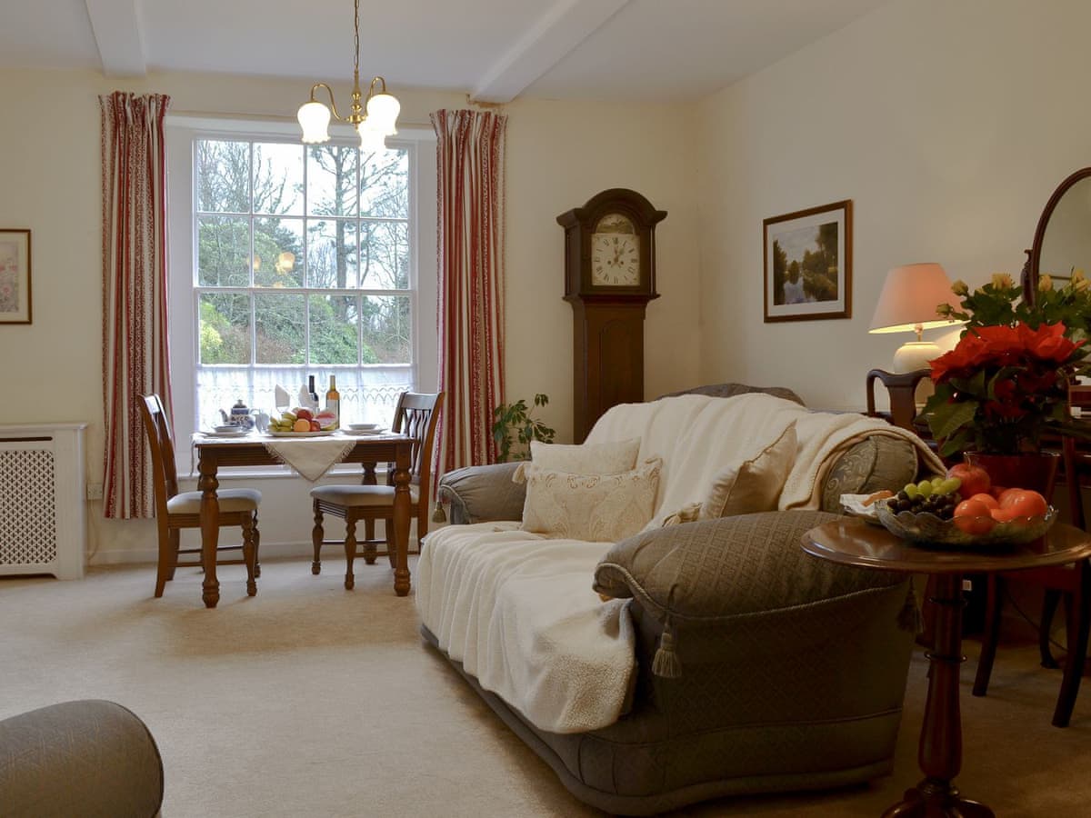 First-floor apartment. Double mezzanine with TV. Bathroom with bath, shower over, basin and WC. Open-plan living space with kitchen, dining area, and sitting area with woodburning stove