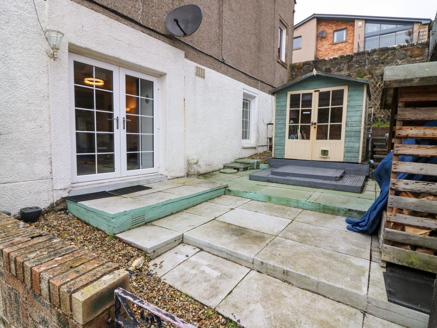 Two bedrooms: 1 x king-size double, 1 x twin. Bathroom with shower over the bath, basin and WC. Ground floor basin and WC. Kitchen with dining area. Sitting room with electric woodburner-effect stove.