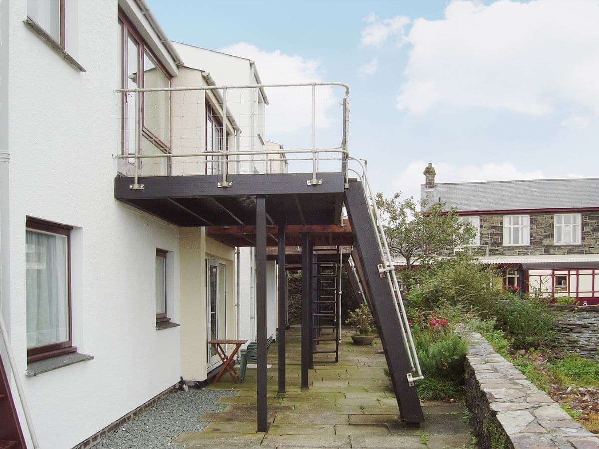 Single-storey. Two bedrooms: 1 x king-size, 1 x twin. Bathroom with bath, walk-in shower, basin, heated towel rail, and WC. Open-plan living space with kitchen, dining area, and sitting area with woodburning stove