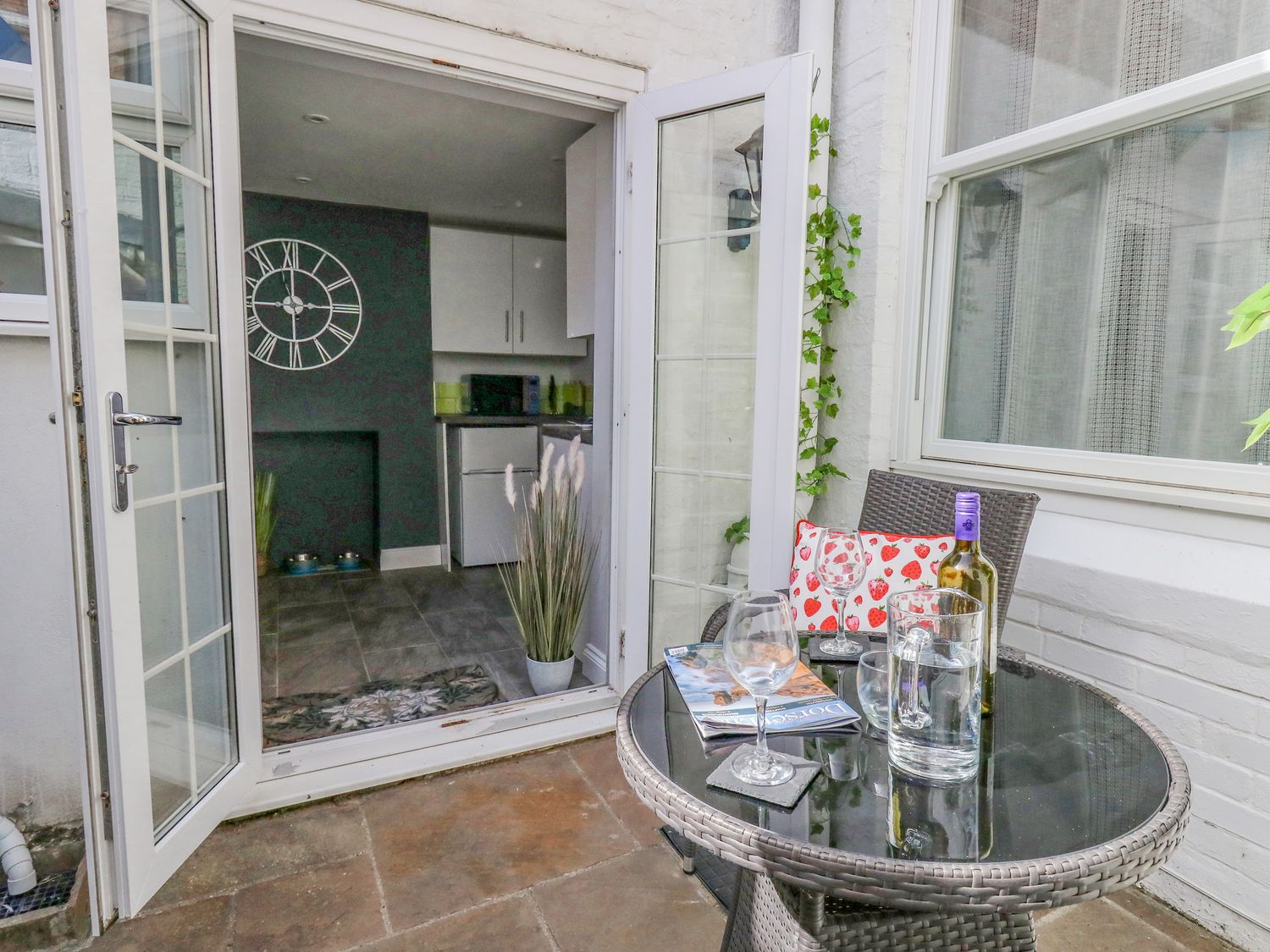 Inside: Open plan living area with super-king size bed Kitchenette with two chairs. Bathroom: Free-standing bath with hand-held shower head, heated towel rail, wash basin and wc.