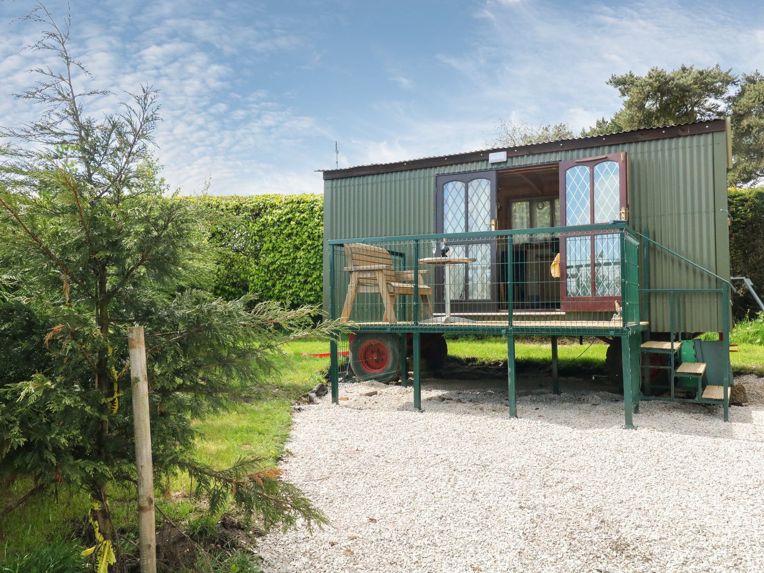 First-floor room with a double bed and sitting area with TV. Wet room with walk-in shower, basin, and WC