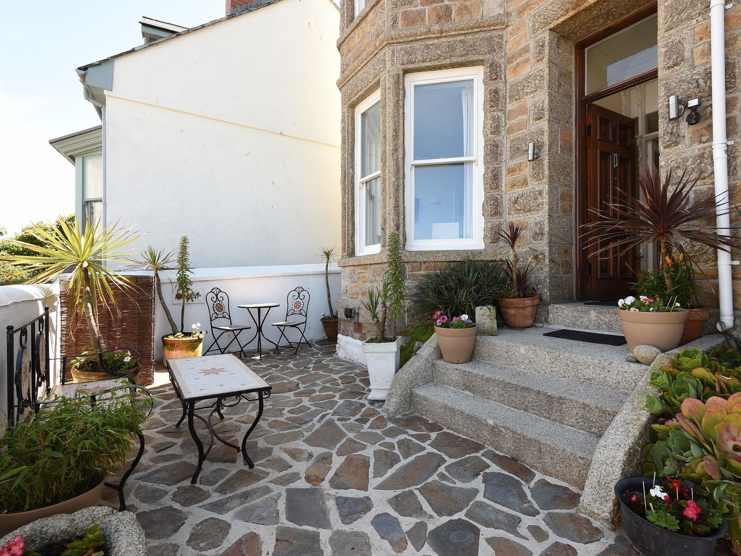 Single-storey. Studio-style layout with twin bed (zip/link, can be super-king-size on request) with freestanding bath, walk-in shower, basin, kitchen, dining area and sitting area. Cloakroom with WC. 2 x shared cloakroom with basin and WC. Shared open-plan living space with kitchen, dining area and sitting area with electric fire. Shared utility