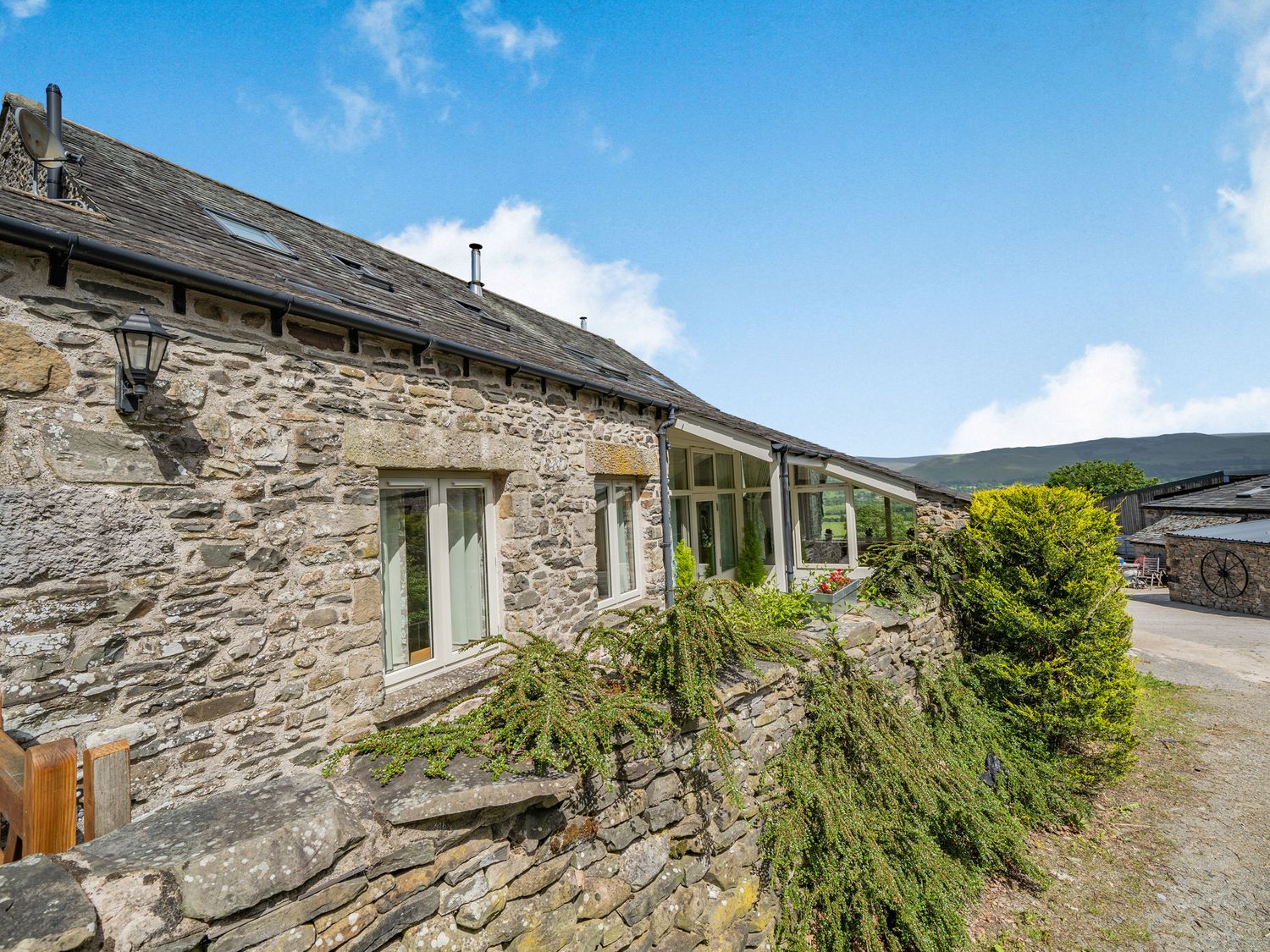 Reverse-level. Two bedrooms: 1 x ground-floor king-size with en-suite walk-in shower, basin and WC, 1 x ground-floor double. Ground-floor bathroom with walk-in shower, basin and WC. First-floor open plan living space with kitchen, dining area and sitting area with balcony and woodburning stove