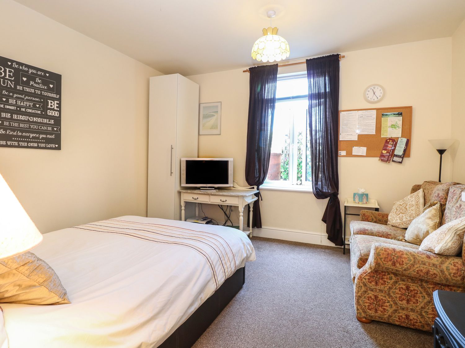 Single-storey. One king-size bedroom. Shower room with walk-in shower, basin, heated towel rail and WC. Open-plan living space with kitchen, dining area, and sitting area