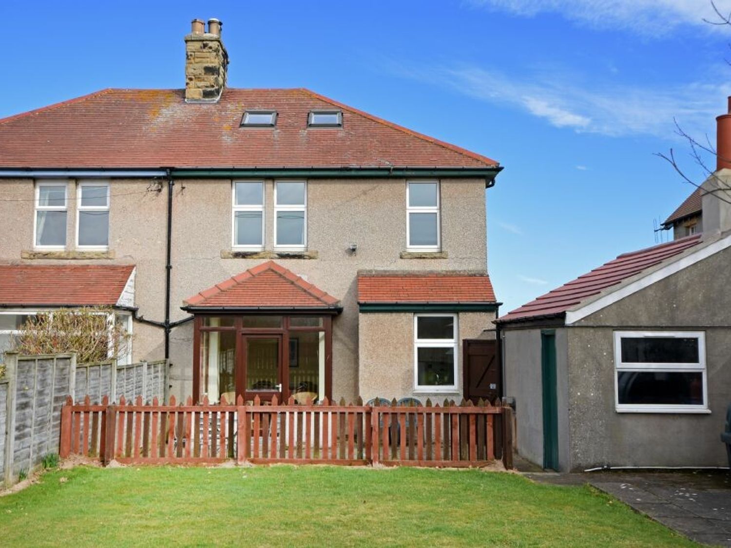 Two bedrooms: 1 x king-size with en-suite basin and WC, 1 x twin with pull-out bed. Bathroom with bath, shower over, basin, heated towel rail, and WC. Kitchen. Living/dining room with woodburning stove
