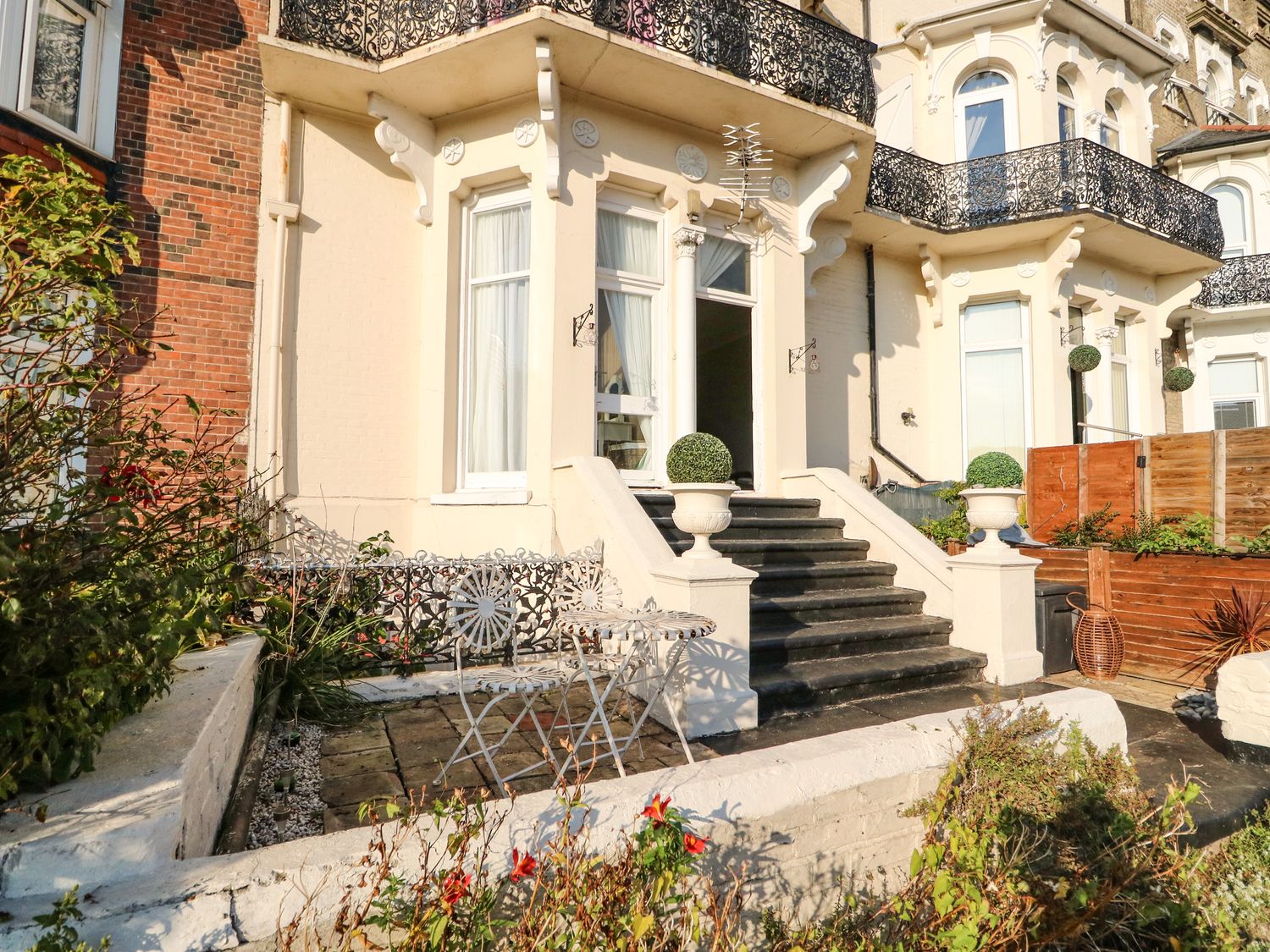 Private lawned garden at side and rear, with hot tub, wooden veranda, seating and BBQ