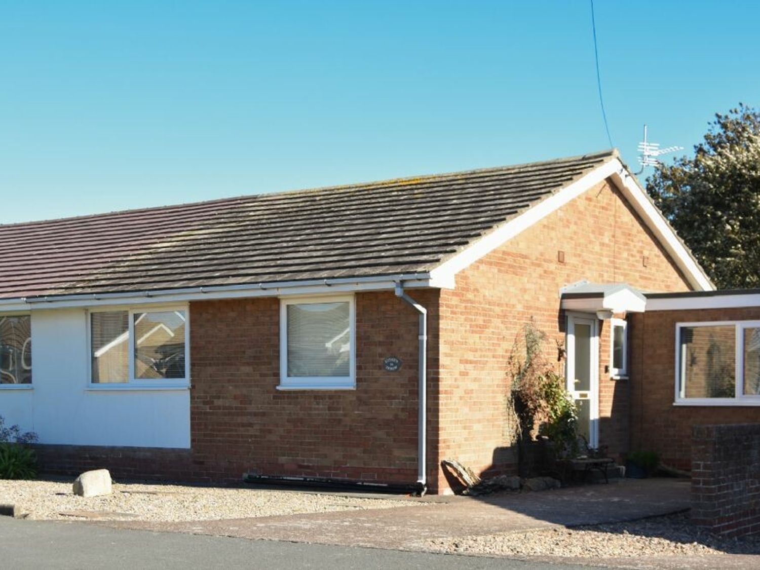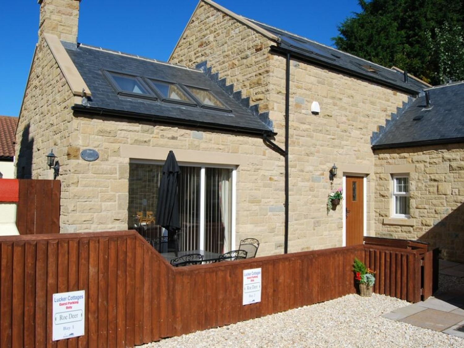 Single-storey. Three bedrooms: 1 x king-size, 1 x double, 1 x twin. Open-plan living space with kitchen, dining area, and sitting area with woodburning stove. External shower room with handheld shower, walk-in shower, basin, heated towel rail, and WC