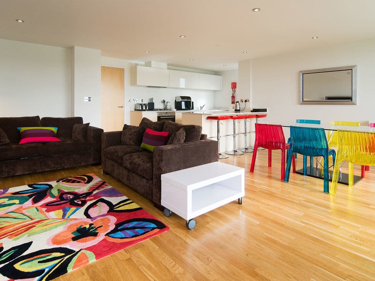 Over 3 floors. Three bedrooms: 1 x lower ground floor family room with 4 x singles (zip/link can be double on request), 1 x first floor king size double (zip/link twin on request) with en suite bath, shower over, basin and WC, 1 x first floor king size double ( zip/link can be twin on request) with en suite shower, basin and WC. Ground floor wet room with shower, basin and WC. Open plan living area with kitchen, dining area and sitting area with woodburner and sofa bed (available at additional charge).