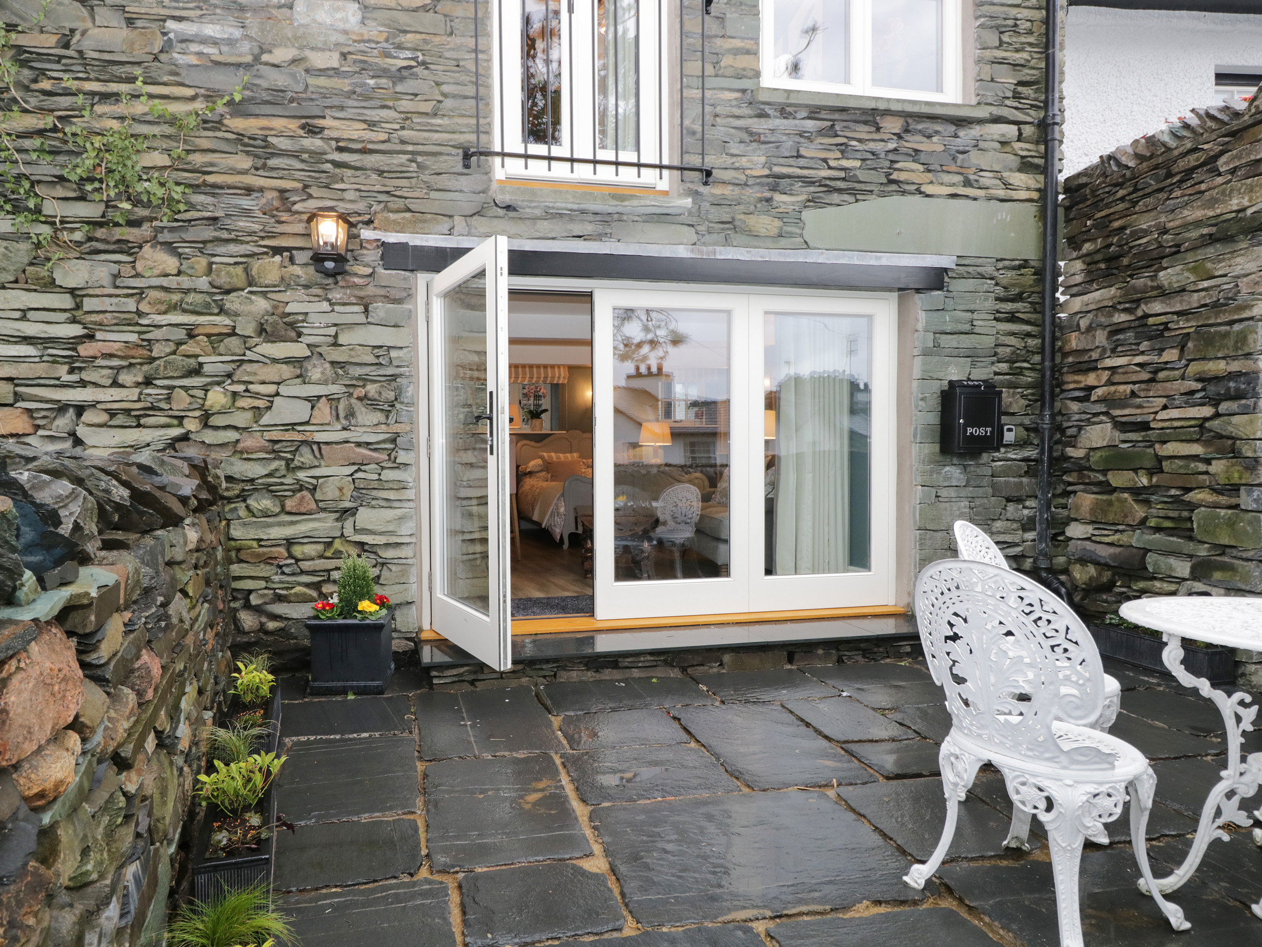 One bedroom: 1 x doublesize. Bathroom with shower over bath, basin, heated towel rail and WC. Open-plan living area with kitchen, dining and sitting area with double sofa bed and gas stove-effect fire