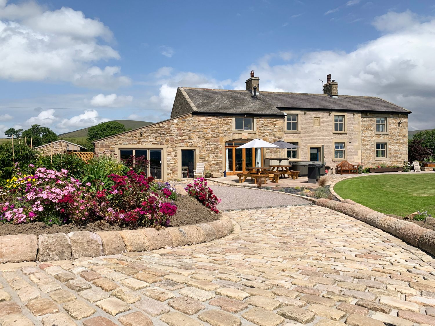 Over three floors. Five bedrooms: 1 x ground floor super king-size zip/link (can be twins on request) with en-suite bath, shower, basin and WC., 1 x first floor king size with en-suite shower, basin and WC, 1 x first floor family room with 1 double and 1 single with en-suite shower, basin and WC, 1 x first floor double, 1 x second floor twin zip/link (can be super king size on request). First floor bathroom with Jacuzzi bath, basin and WC, easy access to hot tub area. Ground floor cloakroom with basin and WC. Kitchen with dining area. Utility. Sitting room (seats 10) with woodburning stove. Second floor snug with double sofa bed.