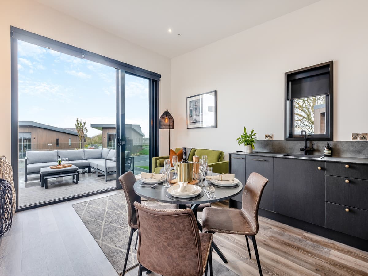 Two bedrooms with en-suite shower, basin and WC: 1 x super king-size double (zip/link, can be twin on request), 1 x king-size double. Ground floor basin and WC. Kitchen with dining area. Sitting room with open fire. Shared external clubhouse with pool table, darts, toilets and two showers.